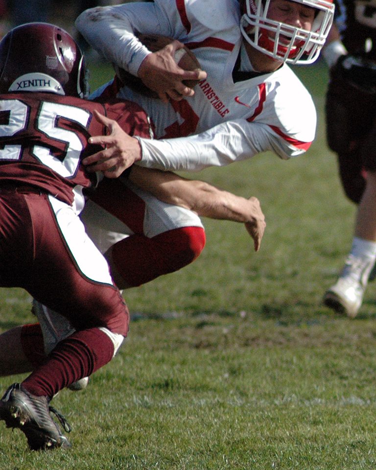 12314140_1084823478214532_3296436795058058197_n Published November 27, 2015 at 768 × 960 in Thanksgiving Game 2015: Barnstable vs. Falmouth #3 Nate Balthazard caught by Falmouth’s #25 Jake Campbell, Capt.